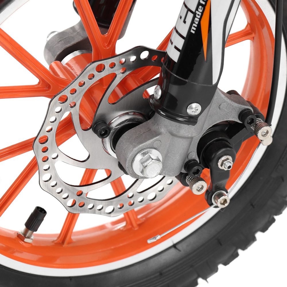 ACCU cross motorbike. Battery 36 V / 8 Ah. Electric engine 500 W. Maximum weight capacity 75 kg. Speed 7 – 25 km / h. Range 20 km. 2.5-10 “wheels. Enduro tires. Alloy rims. Front/rear disc brake. Three speeds. Charging time 8 hours approx. (charger included). Lenght 125 cm. Height 80 cm. Weight 25 kg.