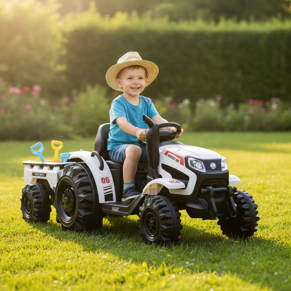 Children’s battery tractor with towing device, suitable for children from 3 to 8 years, battery 12 V/10 Ah, motor 2×35 W, max. load 30 kg, speed 3-5 km/h, MP3 and USB, foam wheels.