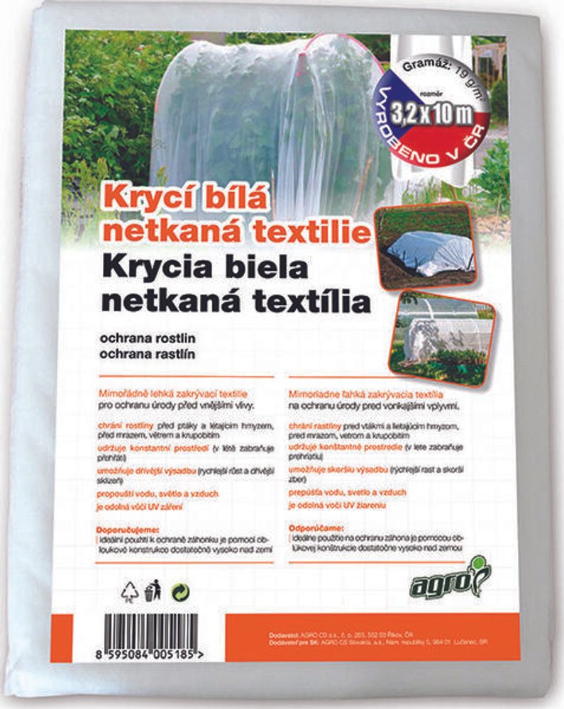 AGRO white non-woven covering fabric protects plants during adverse weather conditions, from frost and cold, rain, wind and excessive sun, and prevents excessive water evaporation from the soil. It successfully protects plants against flying pests. It is an excellent aid for accelerating growth and protecting seedlings.