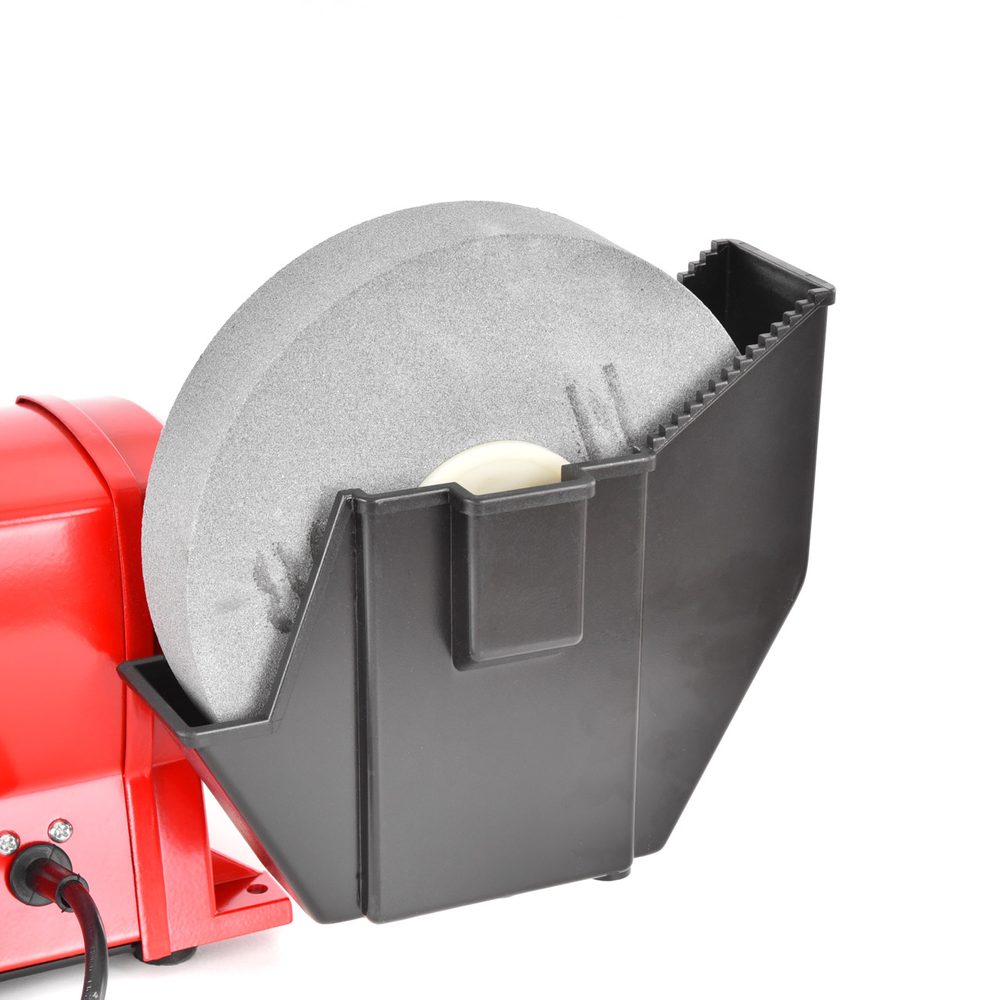 Electric double disc bench grinder. Power consumption 250 W, 2950 rpm. Wheel diameter for dry grinding 150 mm. Wheel diameter for wet grinding 200 mm. Weight 8.2 kg.