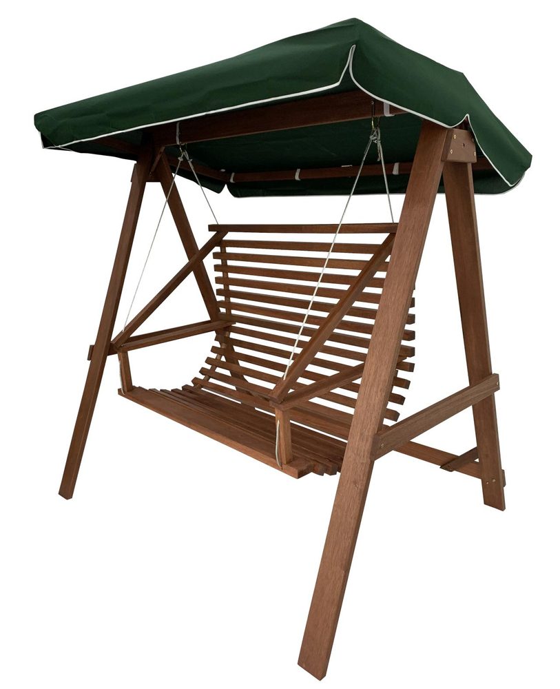 Garden rocking bench with a roof, made of hard tropical Meranti wood. Dimensions: 168 x 123 x 165 cm. Load capacity 200 kg.