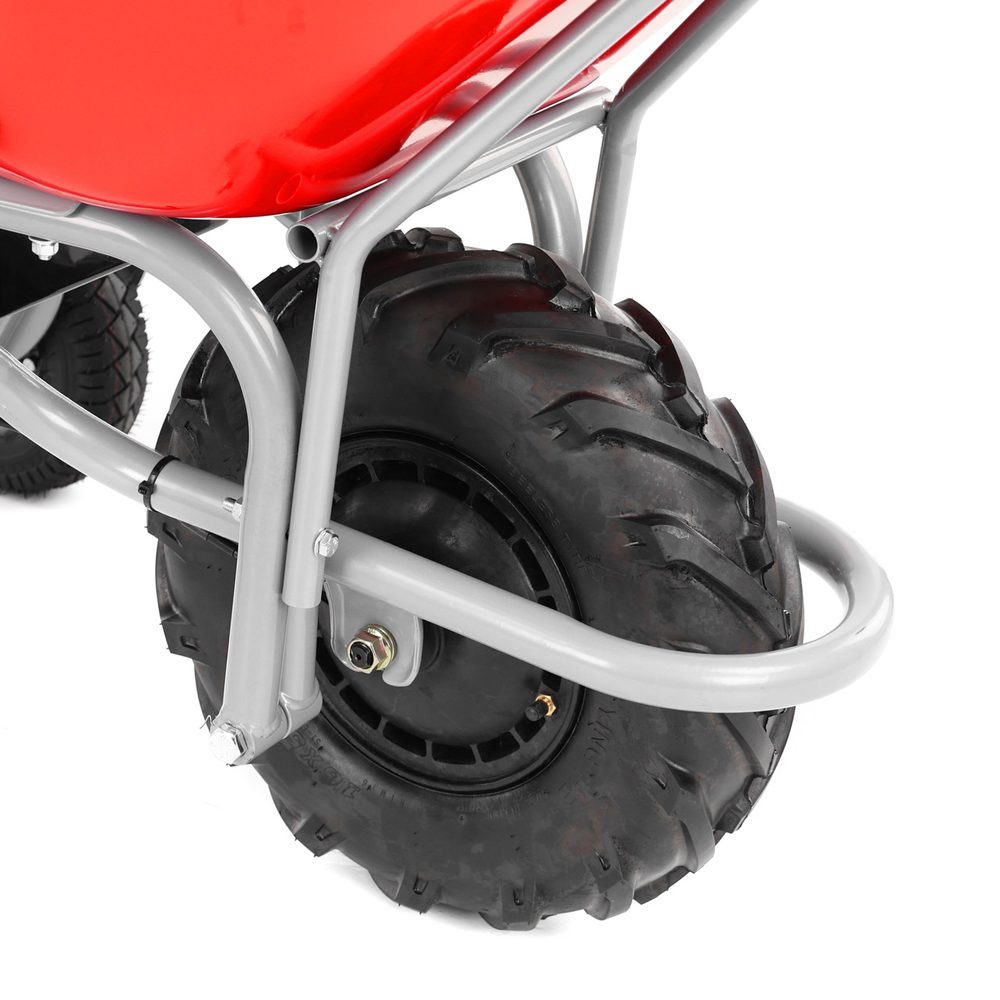 Self-propelled wheelbarrow with a capacity of 100 l and a maximum load capacity of 260 kg. Powered by a 24V battery with a charging time of 7 hours. Ideal for transporting heavy loads in the garden.