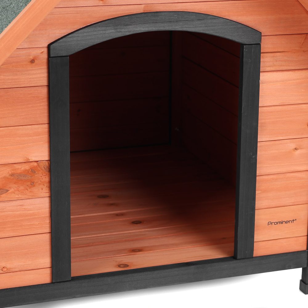 Stylish and durable dog house PROMINENT MIKE made of fir wood with dimensions 82 x 99 x 86 cm. Roof with asphalt shingles provides protection from rain and sun.