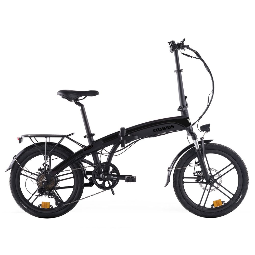 Folding electric bike with 36 V / 8.8 Ah battery. Motor 250 W, wheels 20″, weight 27 kg, range approx. 50 km. Front and rear LED light.