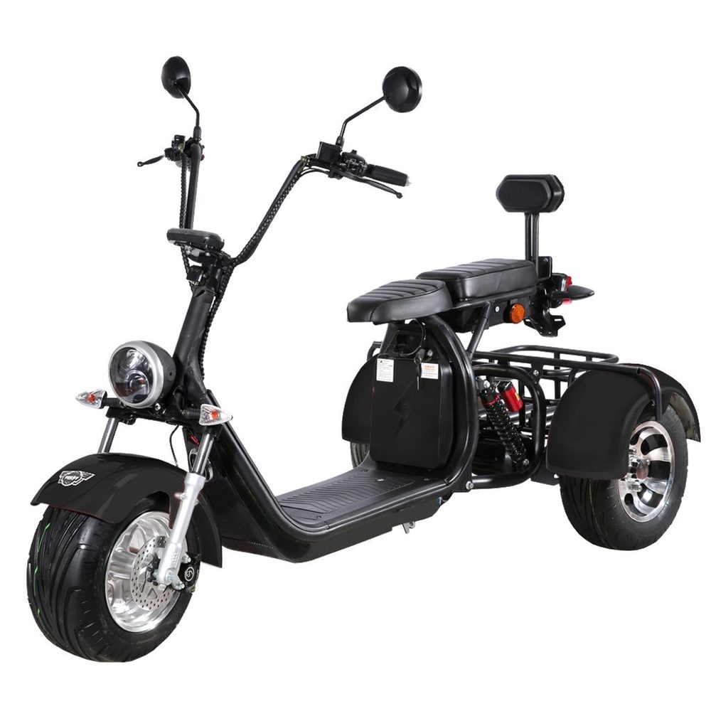 Electric scooter-tricycle. Electric engine 1500W. Battery 60V/20Ah. Max speed 35 km/h. Front-rear disc brakes. Range up to 50 km.