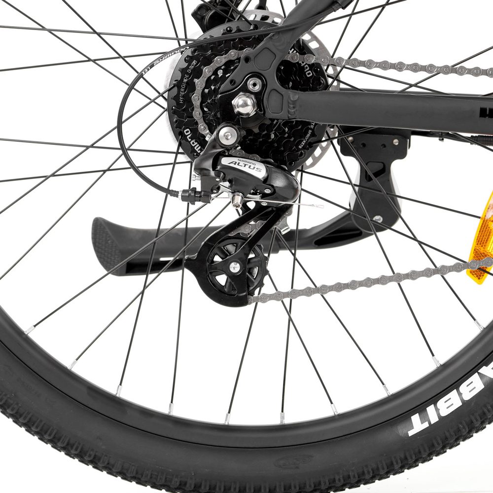 Sports outdoor electric bike HECHT GRIMIS MATT. Shimano derailleur. Front suspension adjustable fork. Hydraulic disc brakes. 18″ aluminium frame with 36 V /14 Ah battery. 250 W motor, 27,5″ wheels, weight 20,5 kg. Range on electric motor up to 110 km. Battery and charger included.