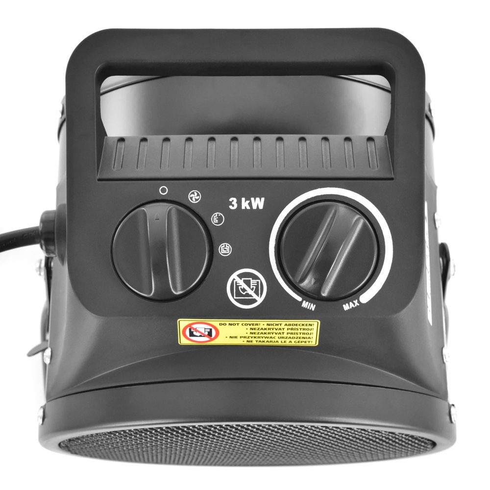 Electric heater with ceramic body. Power consumption 25/2000/3000 W. Heating space 30 m3. May be used as a fan.