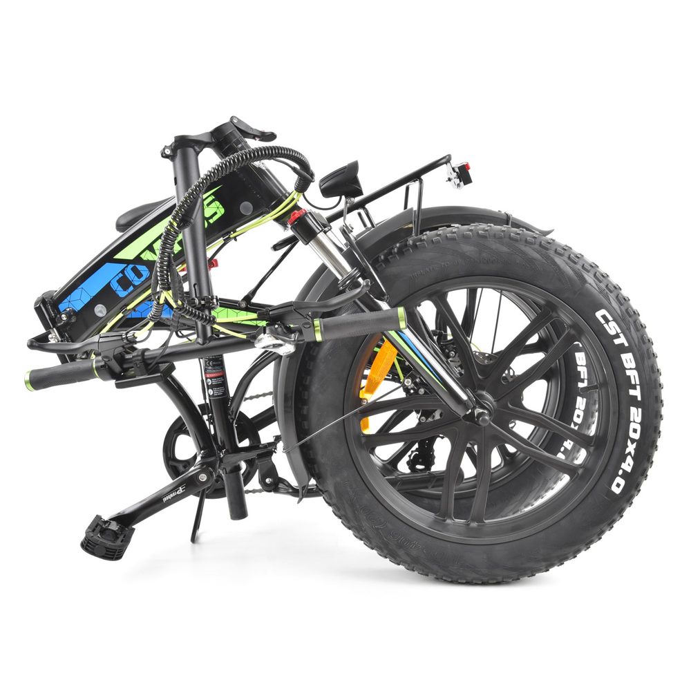 Folding e-bike with 36 V / 10 Ah battery. 250 W motor, 20″ wheels with wide tires (Fat Bike – Snow Bike). Weight 26 kg, range approx. 60 km. LED front and rear lights.