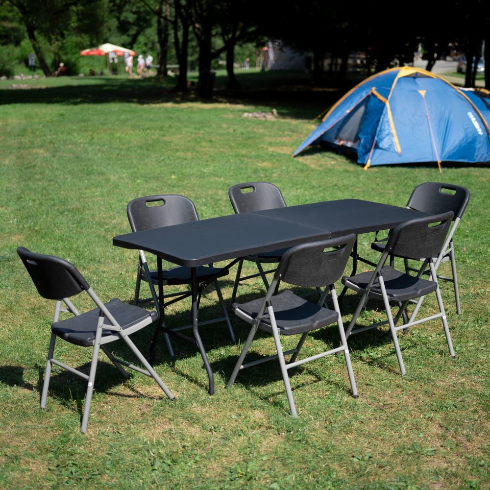 Folding set of six chairs and one table made of steel-aluminium profiles with comaxit coating. Surface of table and chairs made of highly durable plastic.