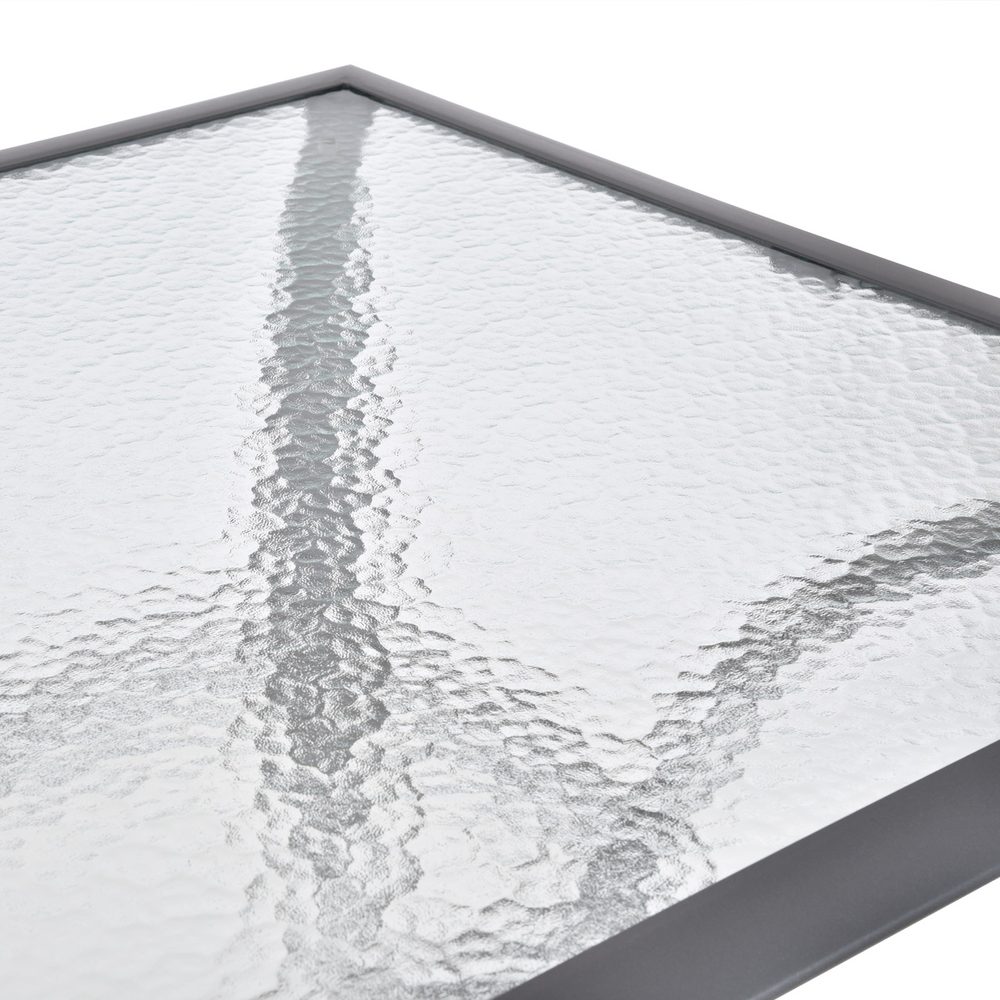 Aluminium construction and tempered glass. Suitable for covered garden areas.