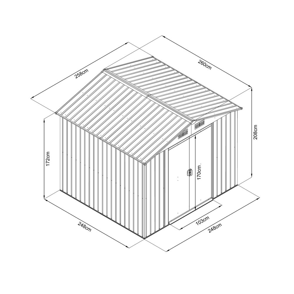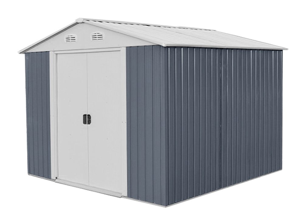 Maintence free, high-quality waterproof garden shed, made of metal construction. L260 x W258 x H208. 0,3 mm board, 0,6 mm zinc steel frame. Double hinged door 170 x 103 cm
