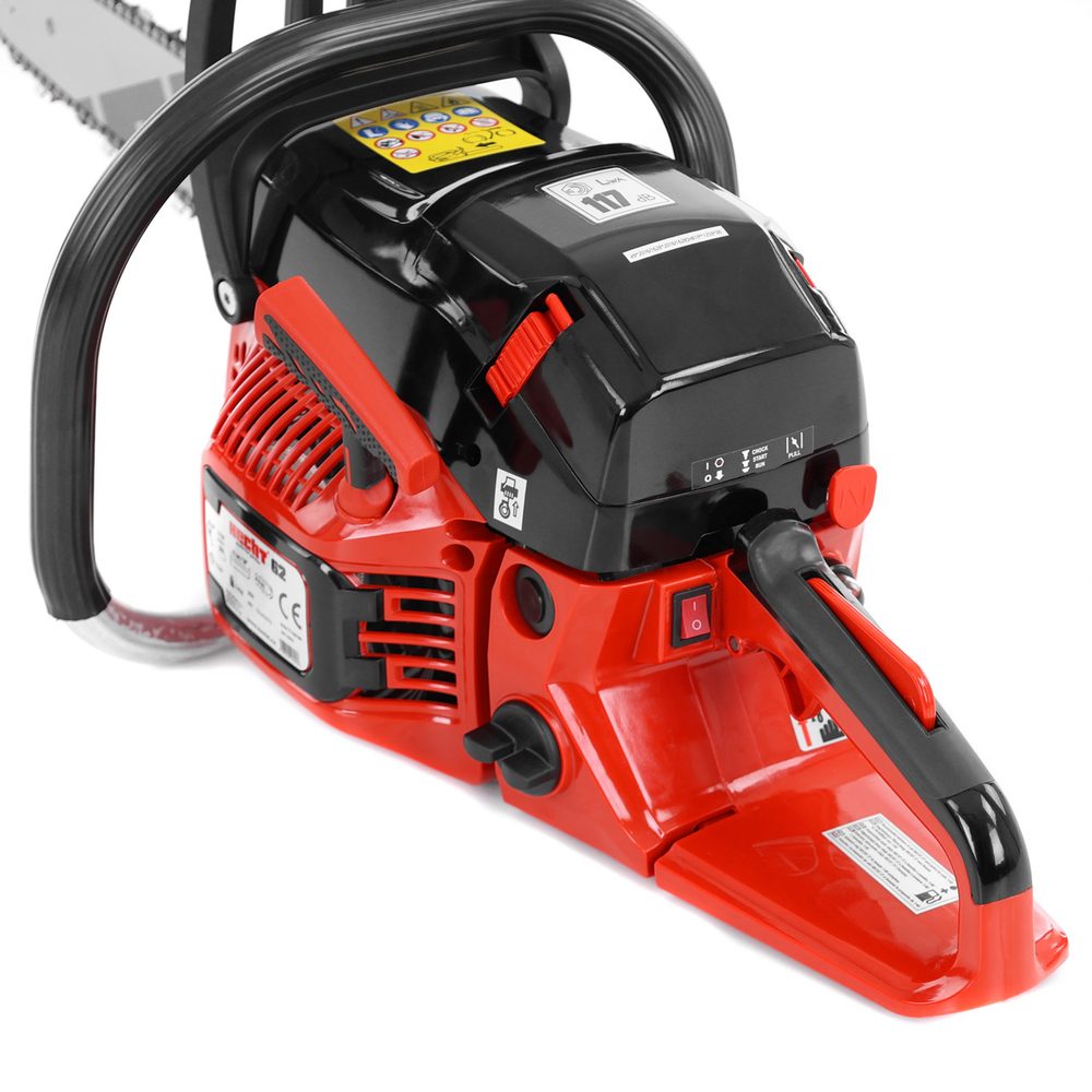 Gasoline chainsaw HECHT 62 with 2.9 kW (4 HP) power at 8500 rpm, featuring a 45 cm bar capable of handling the most demanding tasks. With a 62 cm³ motor volume providing sufficient strength for effective cutting of even hard materials. Weight 5.4 kg.
