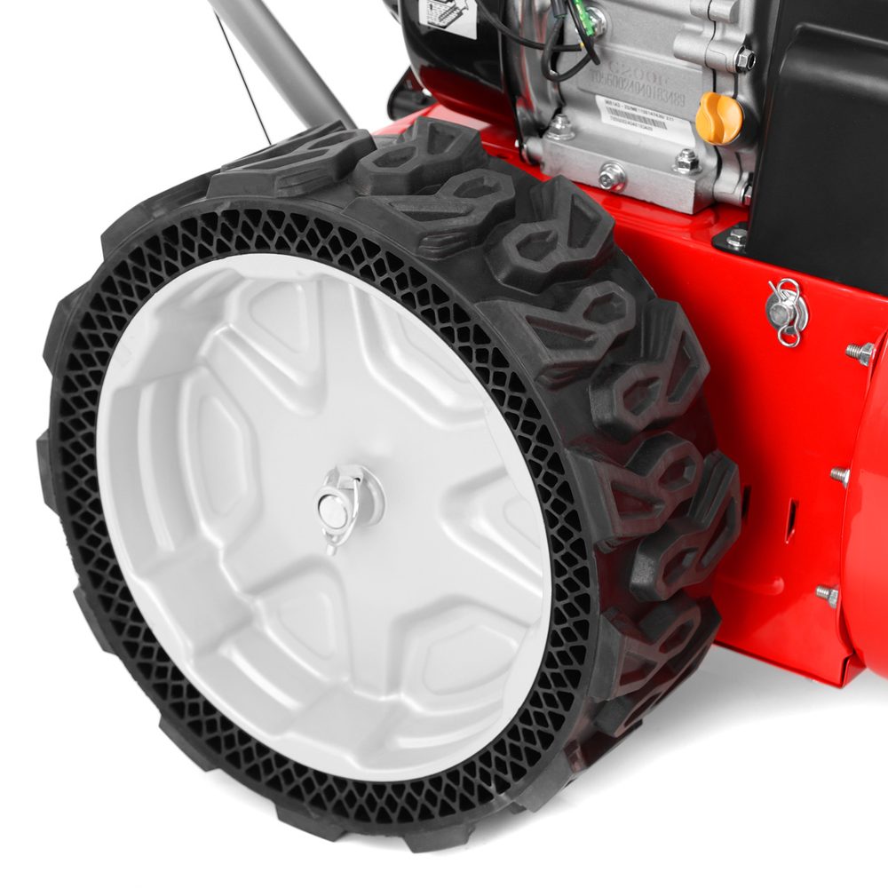Two-stage gasoline snow blower with drive. Hecht OHV motor, max power 6.5 HP. Clearing width 61 cm, height 53 cm. Throwing distance 13 m. 190° chute adjustment. Weight 80.3 kg. Maintenance-free “airless wheels”.