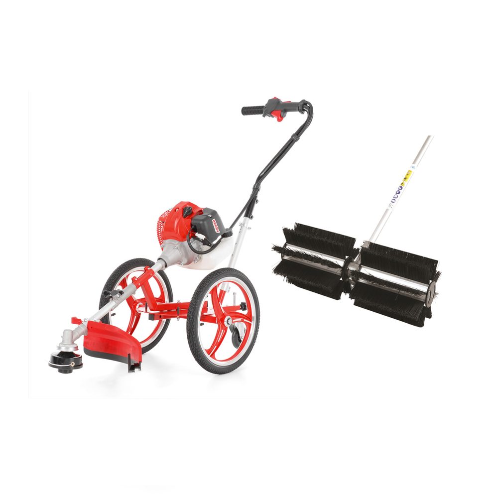 Multifunkční strunový vyžínač na kolech s benzínovým motorem a rotačním kartáčem HECHT 000155. Výkon 1,5 kW (2 HP), obsah 51,7 cm3. Hmotnost 15,5 kg.