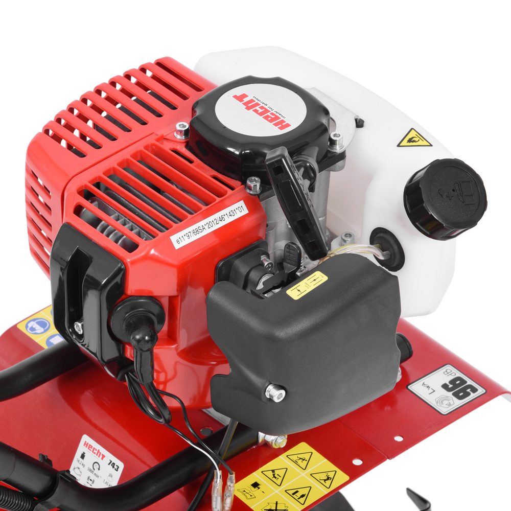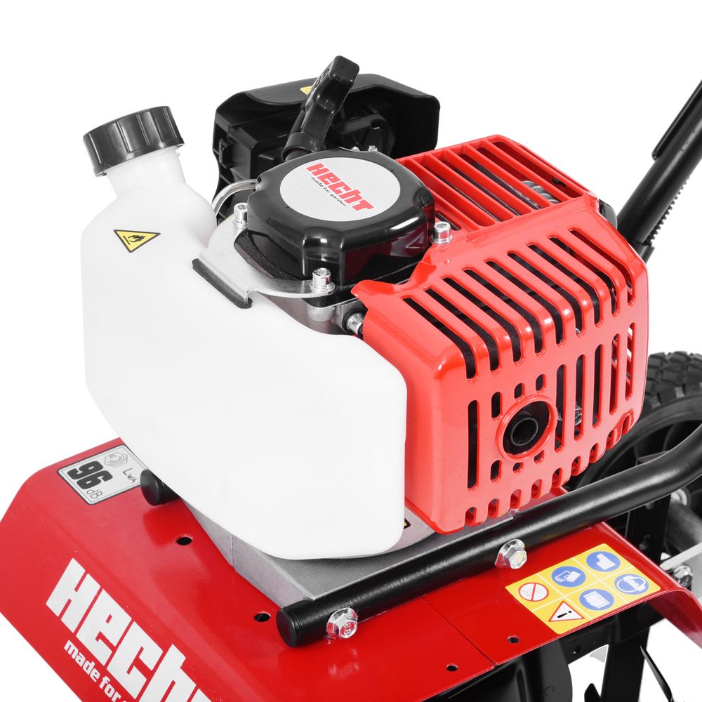 Petrol powered tiller equipped with HECHT 2 stroke engine, 43 cc. Working width 23,5 cm.