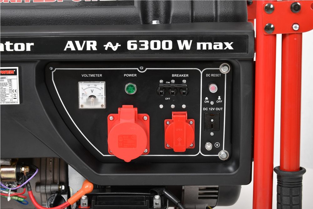 Na elektrickém panelu je digitální displej pro kontrolu generovaného napětí (voltmetr), kontrolka hladiny oleje,…