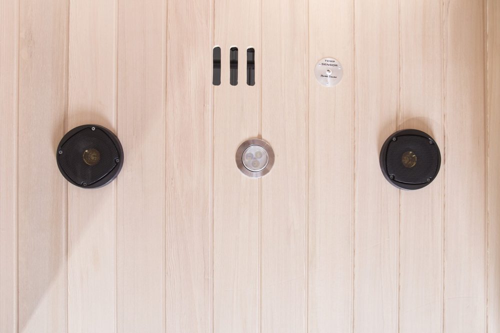 Infrared sauna for two persons. Power 2080 W, 5 ceramic heating elements. Temperature 30 – 60 °C. Built-in MP3 player with FM radio. Dimensions 100 x 120 x 190 cm.