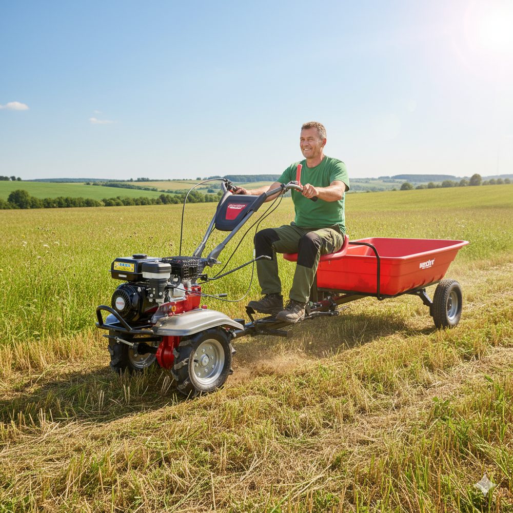 Motor cultivator set with wheels and plowing plow. 212 cm3 engine with a rated output of 3.6 kW. Weight 78 kg. Convertible to a single-axle tractor.