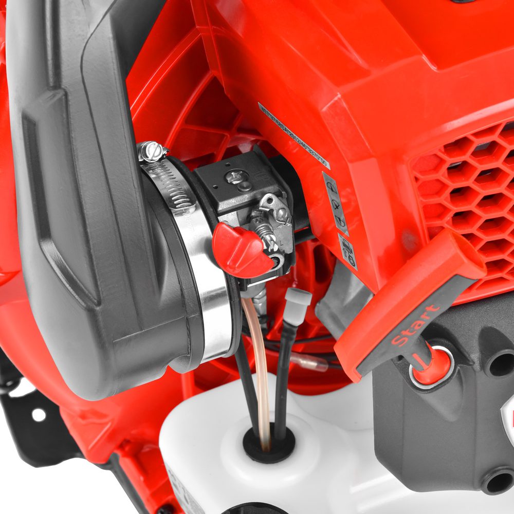 Operating engine speed is 7300rpm, in combination with high-quality turbine produces blowing performance 1490m³ air/hour. Operating with the blower can produce some dust, therefore is engine equipped with a big and quality air filter which substantially increase its lifetime. For easy start of the engine is carburettor equipped with a choke and a primer for manual batching of fuel.