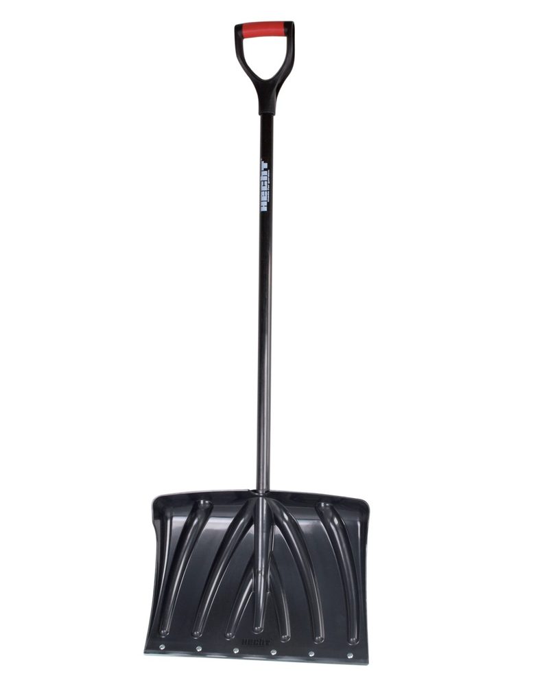 Plastic snow shovel with plastic handle reinforced with steel tube, Softened polypropylene handle. Height 131 cm. Working width 46 cm.