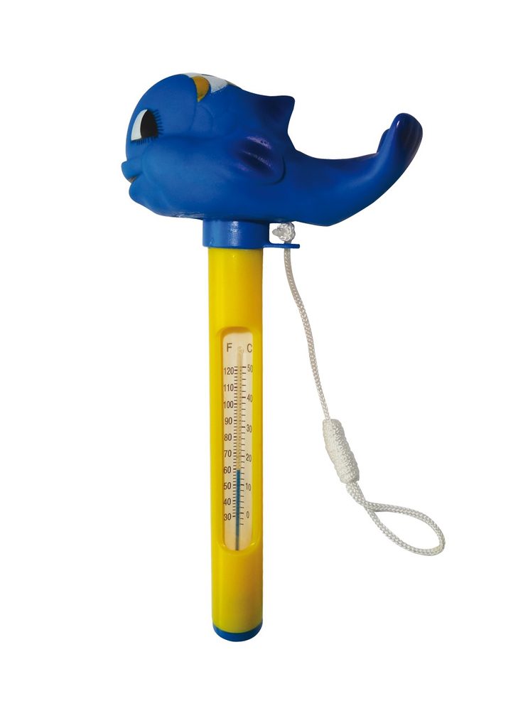 Pool thermometer with dolphin-shaped float. Mercury-free.