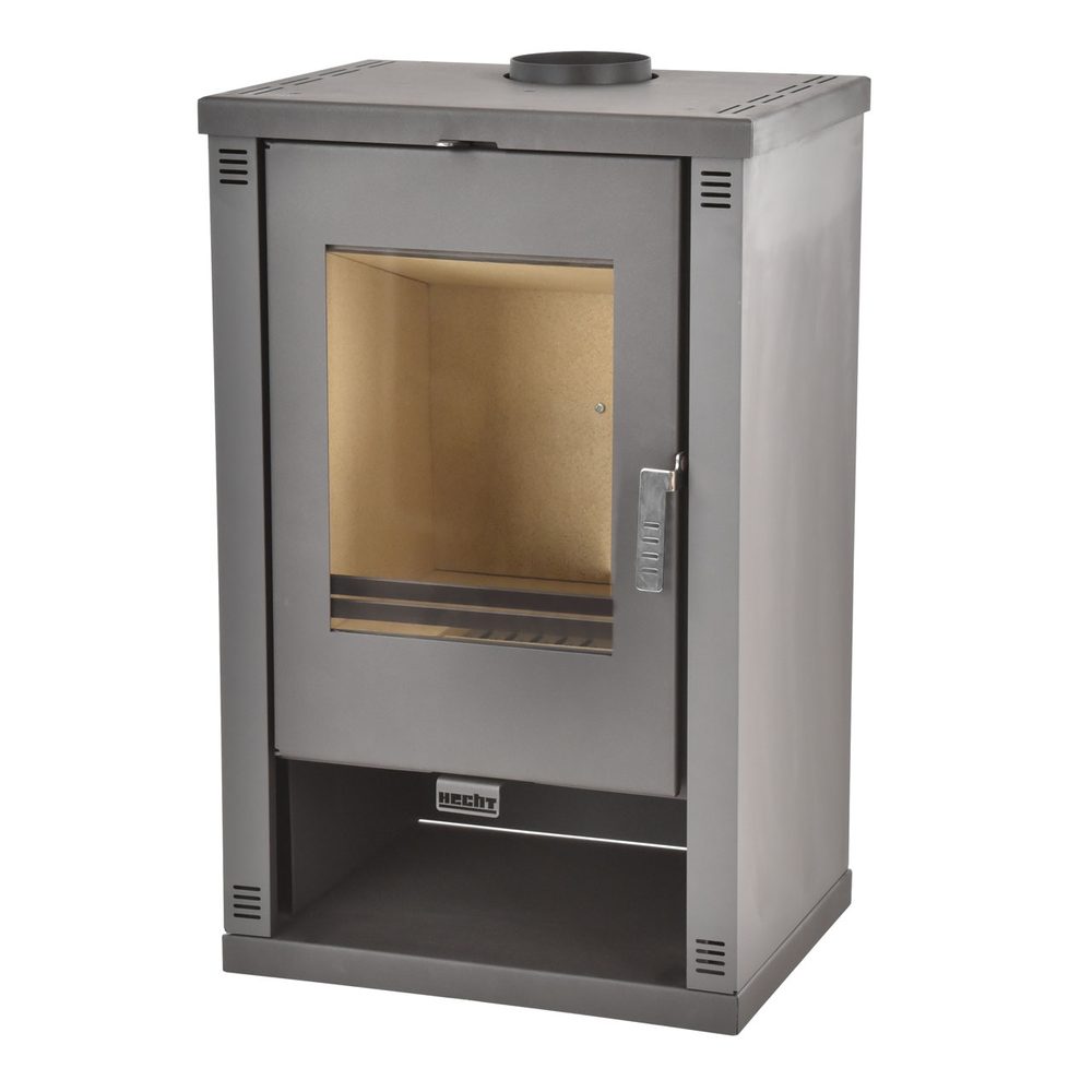 Steel wood-burning stove with a glass door made of heat-resistant glass and a heating output of 11 kW. Flue 150 mm. Weight 83 kg. Made in Europe.